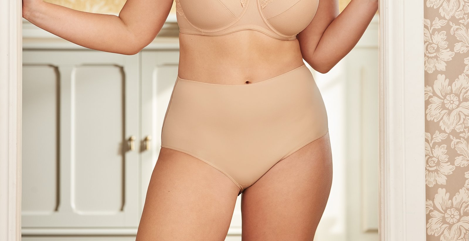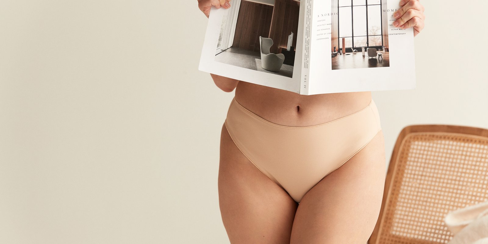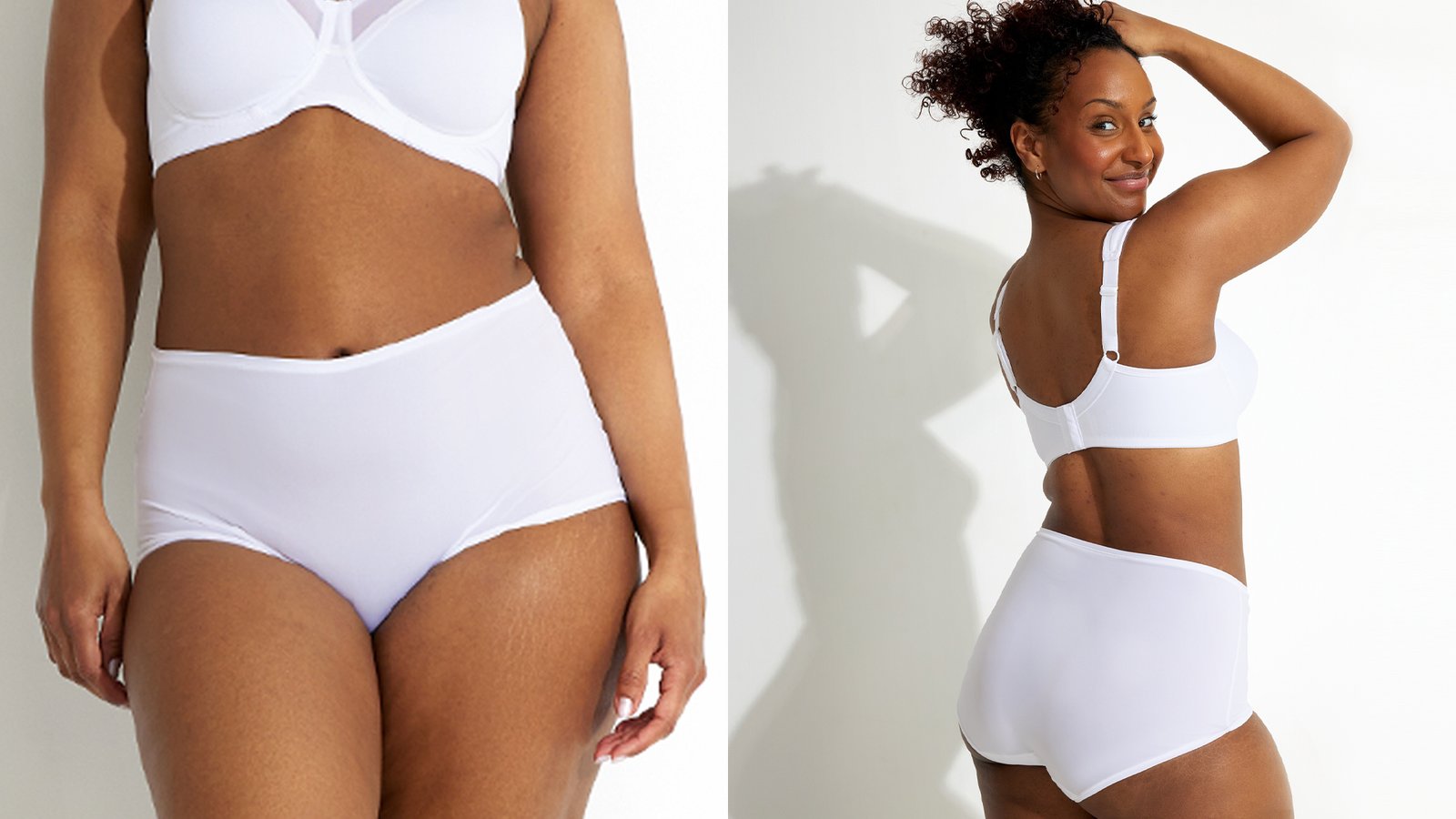 The Midi and Tai panties are perfect base layers with a flattering cut for all body types. The model has a high waist and high-cut leg.