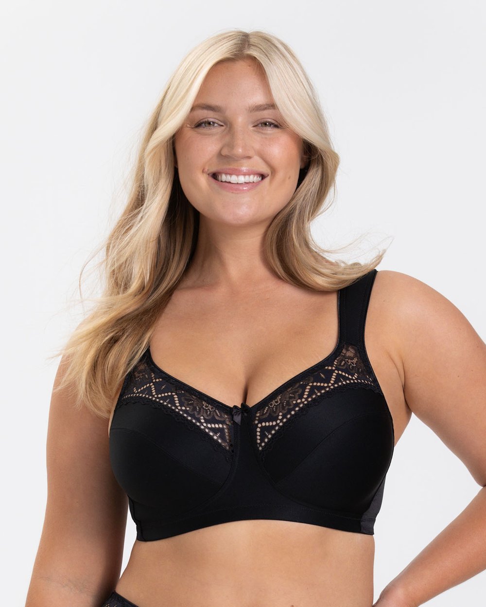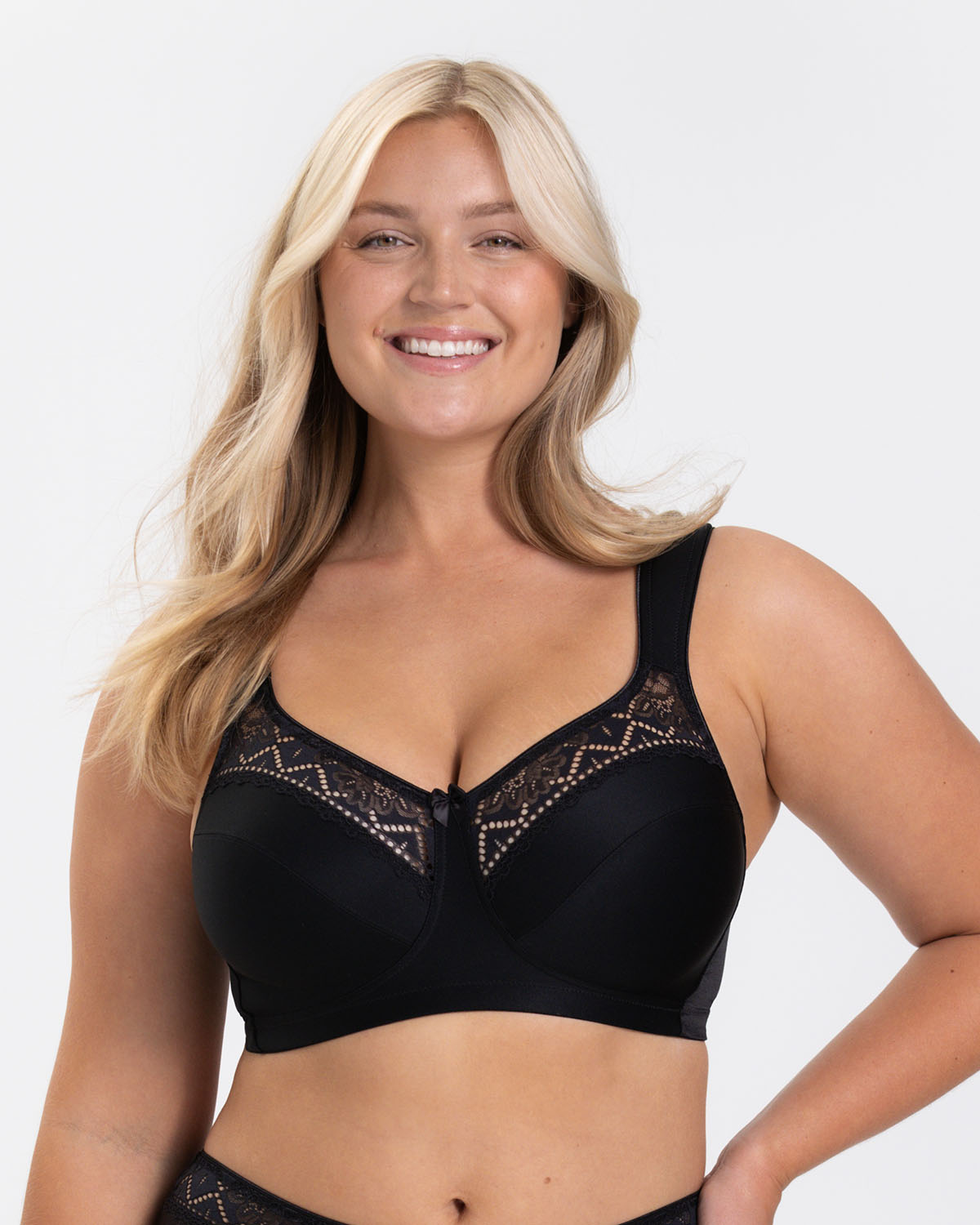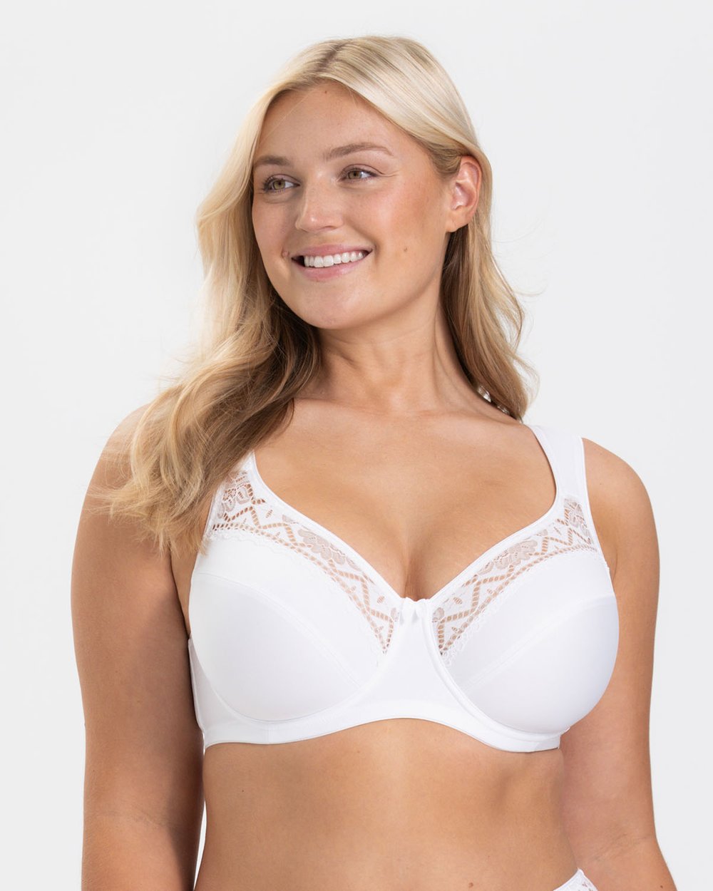 The two-part cup has a rounded shape, is unlined and unpadded. The perforated, stretchy lace band on the upper part of the cup gives the bra a modern look for those who desire a sleek detail.